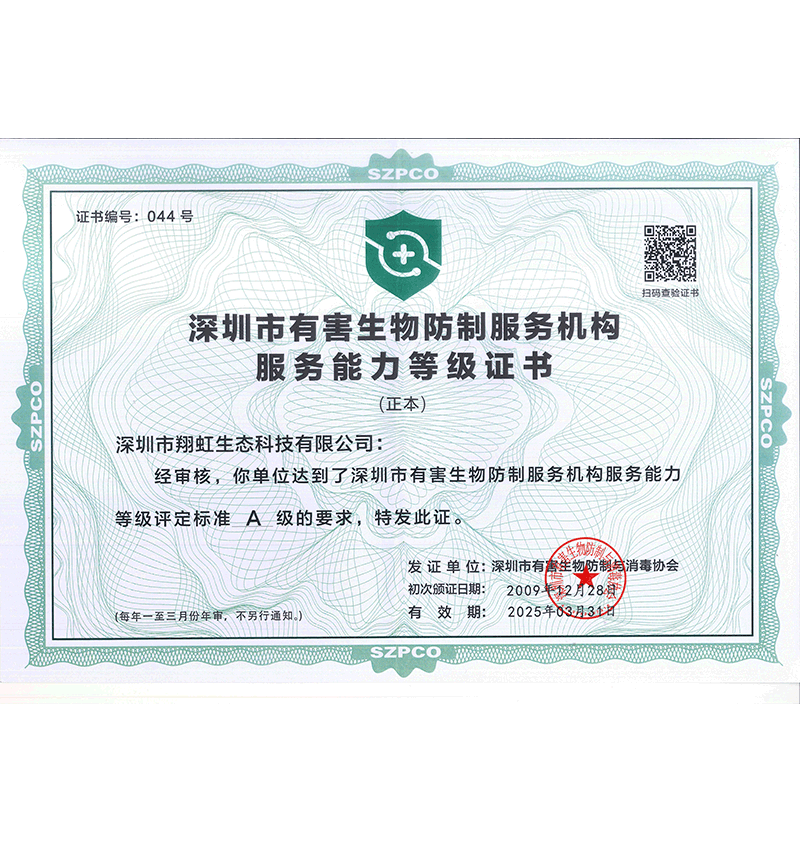 深圳市翔虹生態(tài)科技有限公司成立于1995年,是深圳最早成立的專業(yè)蟲害防治公司之一。公司發(fā)展至今獲得全國有害生物防制服務(wù)A級資質(zhì)、廣東省有害生物防制服務(wù)A級資質(zhì)、深圳市有害生物防制服務(wù)A級資質(zhì)、廣東省有害生物防制服務(wù)A級資質(zhì)、深圳市有害生物防制服務(wù)甲級資質(zhì)的單位,是中國有害生物防治協(xié)會會員、廣東省有害生物防治協(xié)會會員、深圳市有害生物防治協(xié)會理事單位,多次獲得“深圳市十佳消殺單位”榮譽。